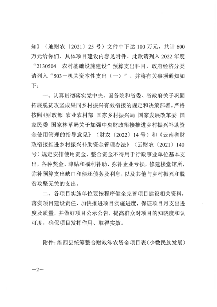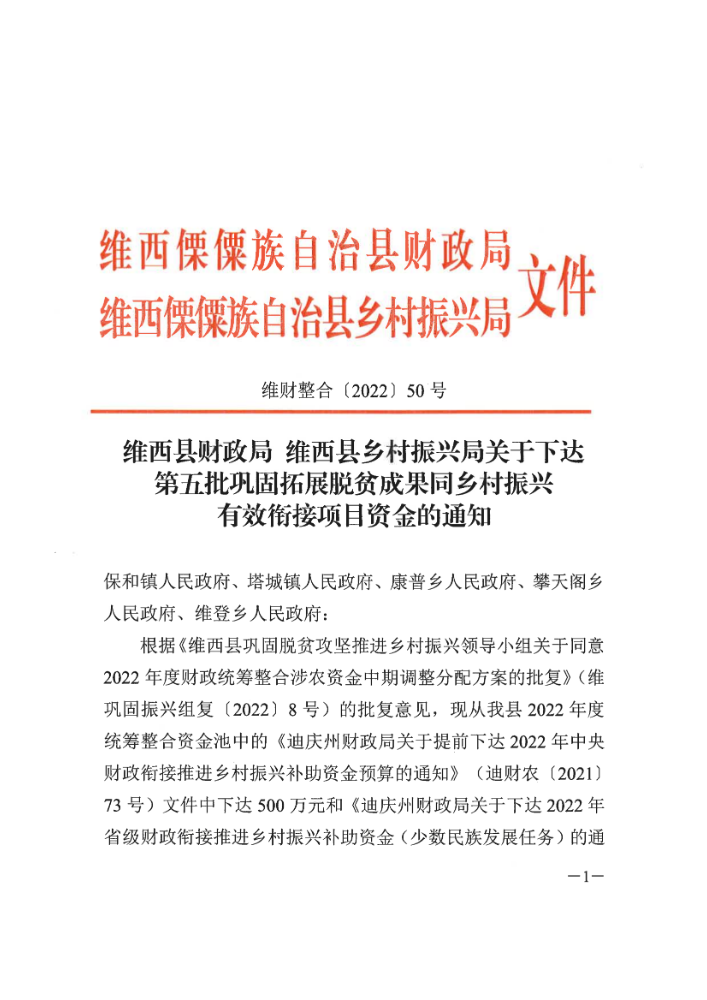 维西县财政局 维西县乡村振兴局关于下达第五批巩固拓展脱贫攻坚成果同乡村振兴有效衔接项目资金的通知