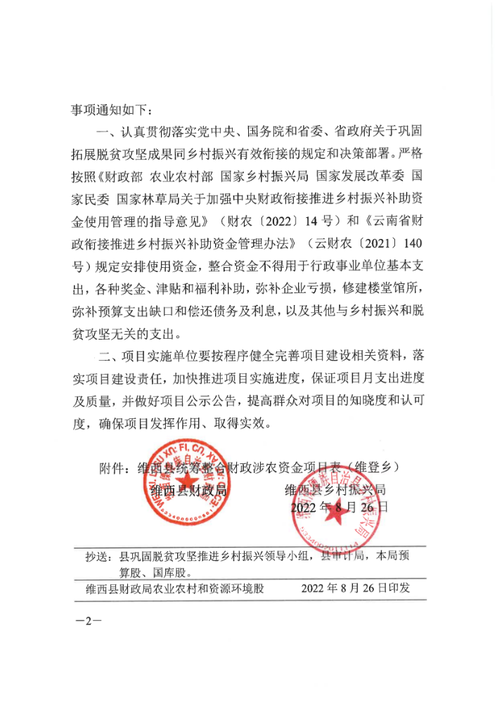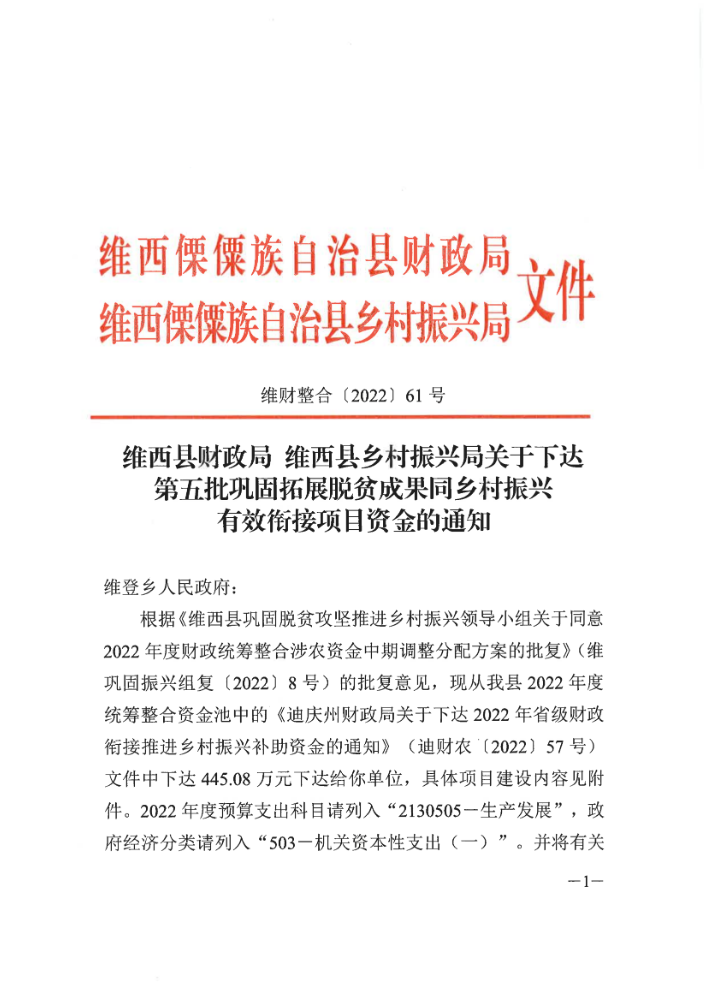 维西县财政局 维西县乡村振兴局关于下达第五批巩固拓展脱贫攻坚成果同乡村振兴有效衔接项目资金的通知