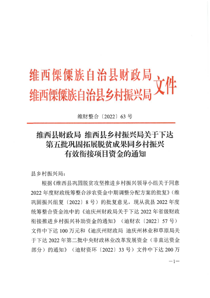 维西县财政局 维西县乡村振兴局关于下达第五批巩固拓展脱贫攻坚成果同乡村振兴有效衔接项目资金的通知