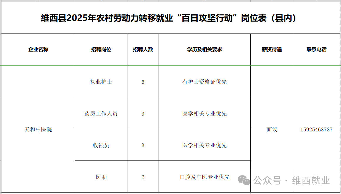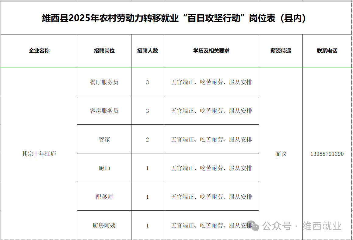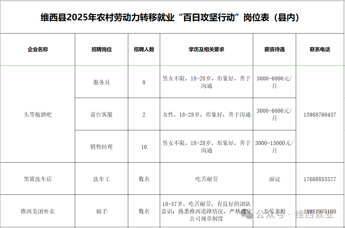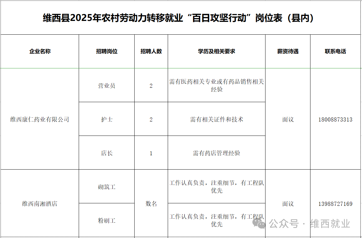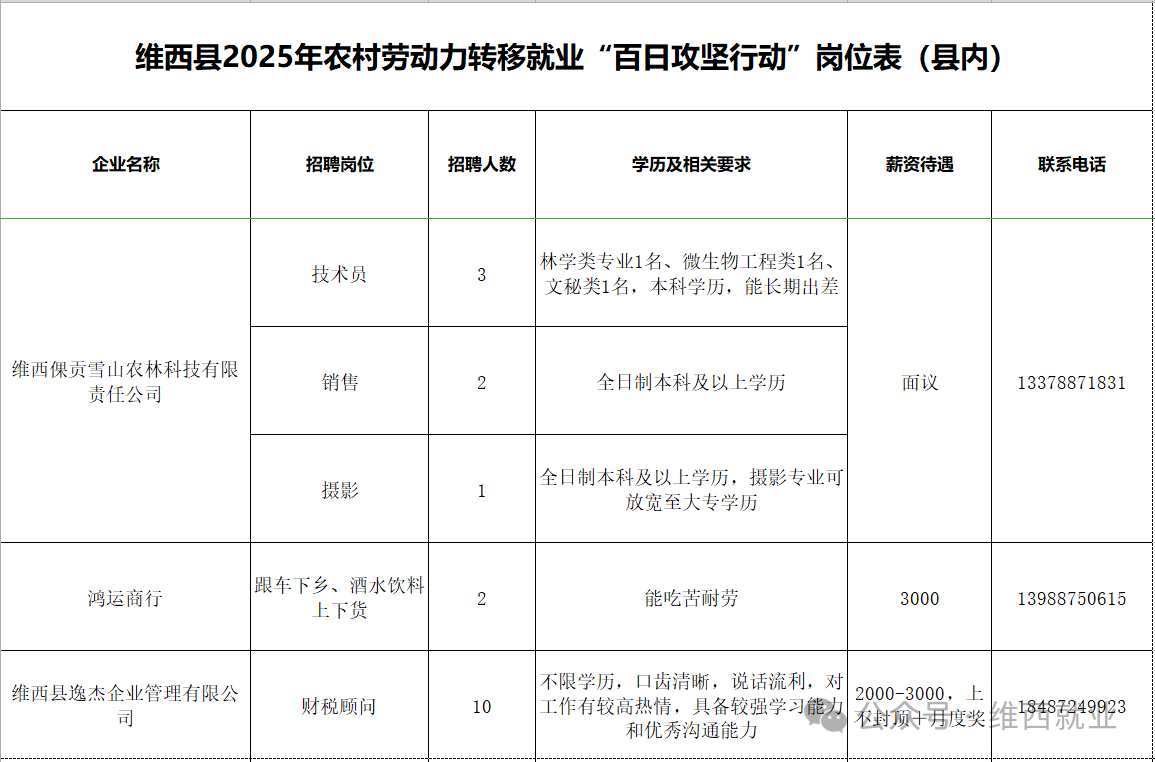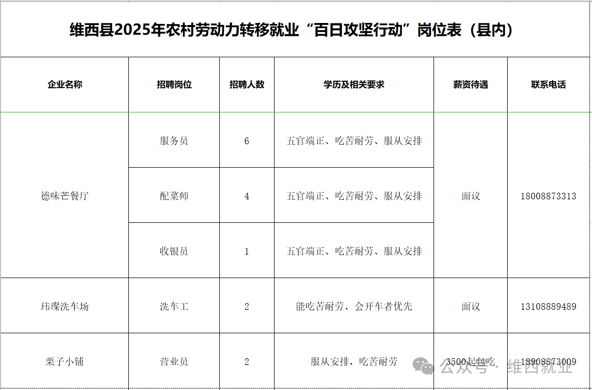 维西县2025年农村劳动力转移就业“百日攻坚行动”岗位表第一期(县内)
