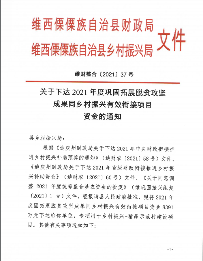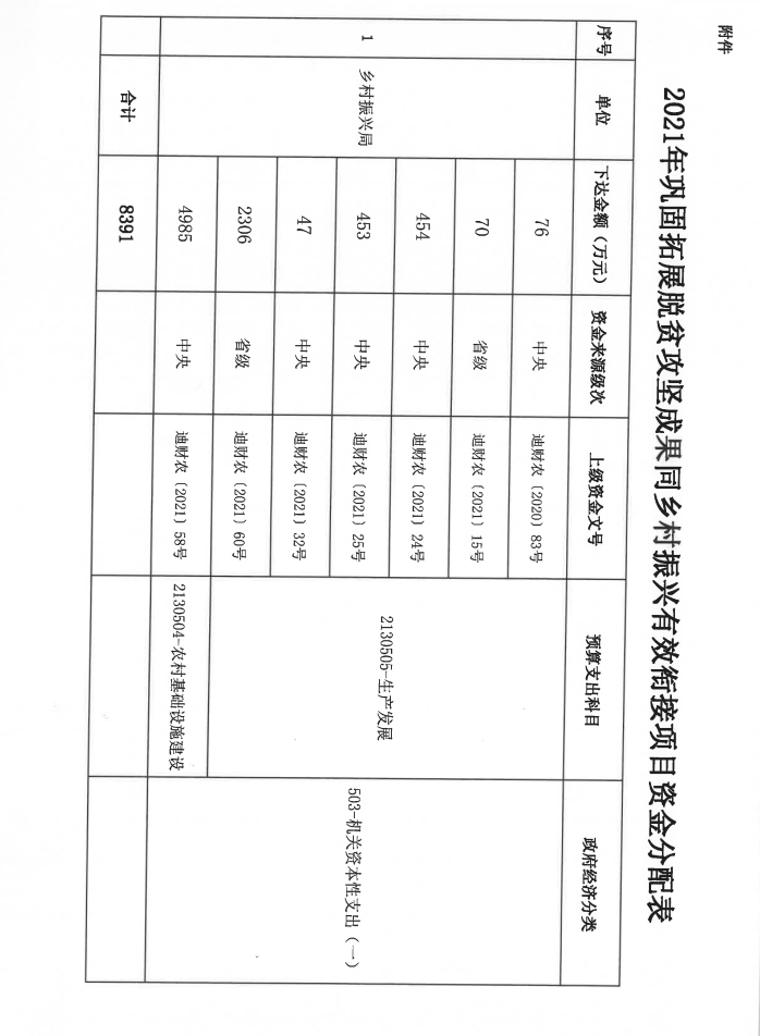 关于下达2021年度巩固拓展脱贫攻坚 成果同乡村振兴有效衔接项目资金的通知