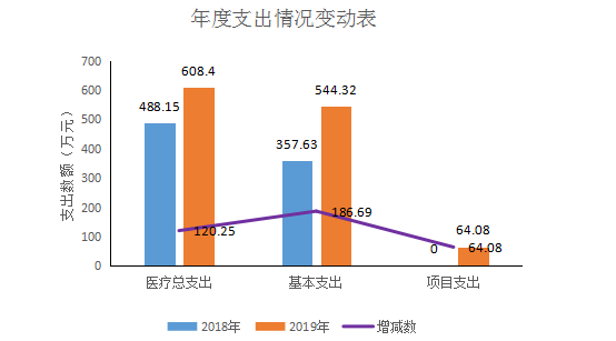 叶枝中心卫生院2019年度支出合计608.41万元。其中:基本支出544.33万元,占总支出的89.47%;项目支出64.08万元,占总支出的10.53%;上缴上级支出、经营支出、对附属单位补助支出共0万元,占总支出的0%。与上年对比叶枝中心卫生院2018年度支出合计488.15万元。其中:基本支出488.15万元,占总支出的100%;项目支出0万元,2019年度支出合计比上年增加120.26万元,主要原因分析2019年度实行健康扶贫村卫生室全部开展医疗业务,采购药品在卫生院采购,卫生院药品和卫生材料大幅度增加,临时聘用人员有10人工资支出增加等原因支出加大,本年度公共卫生项目支出纳入决算项目支出增加。