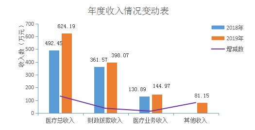 叶枝中心卫生院2019年度收入合计624.2万元。其中:财政拨款收入398.07万元,占总收入的63.77%;上级补助收入0万元,占总收入的0%;事业收入144.97万元(含教育收费0万元),占总收入的23.22%;经营收入0万元,占总收入的0%;附属单位缴款收入0万元,占总收入的0%;其他收入81.15万元,占总收入的13%。与上年对比叶枝中心卫生院2018年度收入合计492.45万元。2019年比上年增加131.75万元。其中:2018年度财政拨款收入361.57万元,2019年比上年增加36.62万元;上级补助收入0万元,占总收入的0%;2018年度事业收入130.88万元,2019年比上年增加13.22万元;经营收入0万元,占总收入的0%;附属单位缴款收入0万元,占总收入的0%;2018年其他收入0万元,2019年比上年增加81.15万元。主要原因分析财政拨款增加主要原因人员增加财政拨款增加,病人了量增加医疗业务收入比上年度有增加,其他收入增加主要是本年度卫生健康局拨入公共卫生专项等经费增加,并且实施政府会计制度专项全部归属于其他收入里面决算,造成本年度其他收入增加。