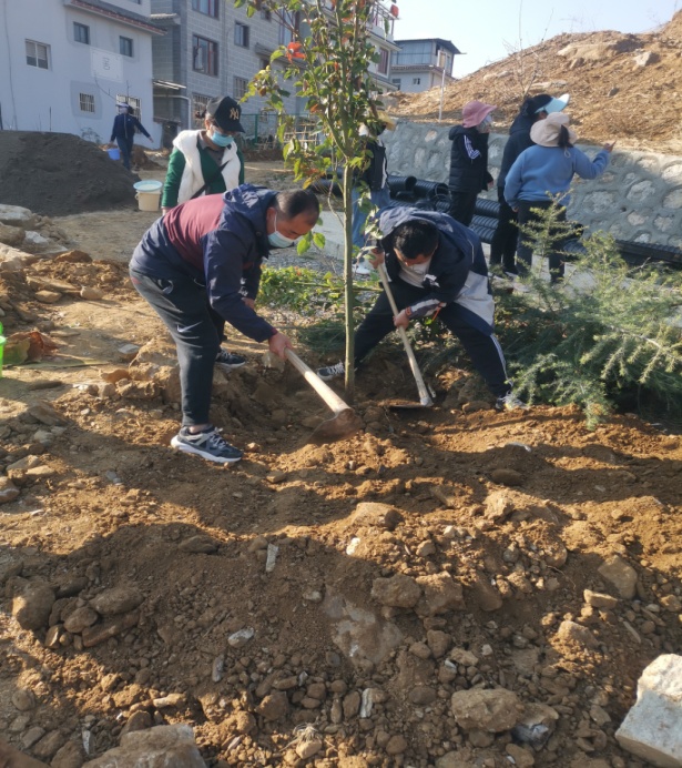 植树现场热闹非凡,干部职工充分发挥团队协作精神,