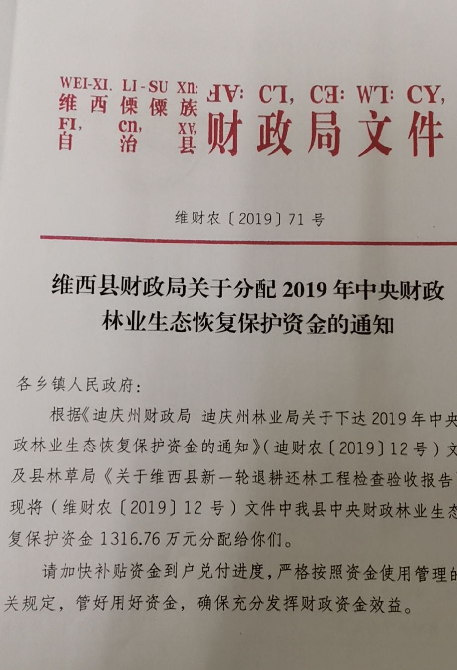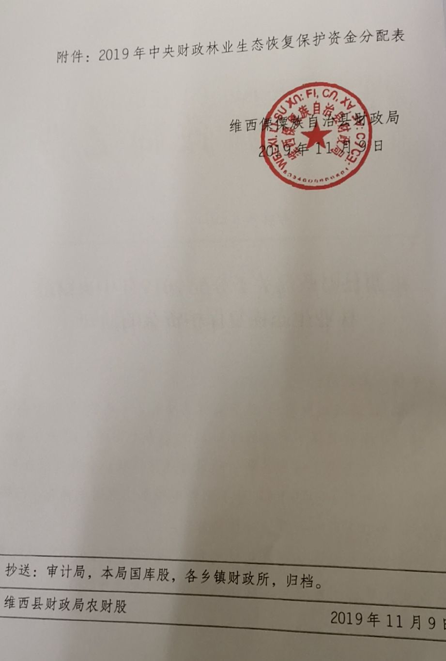 【信息公开】关于分配2019年中央财政林业生态恢复保护资金的通知