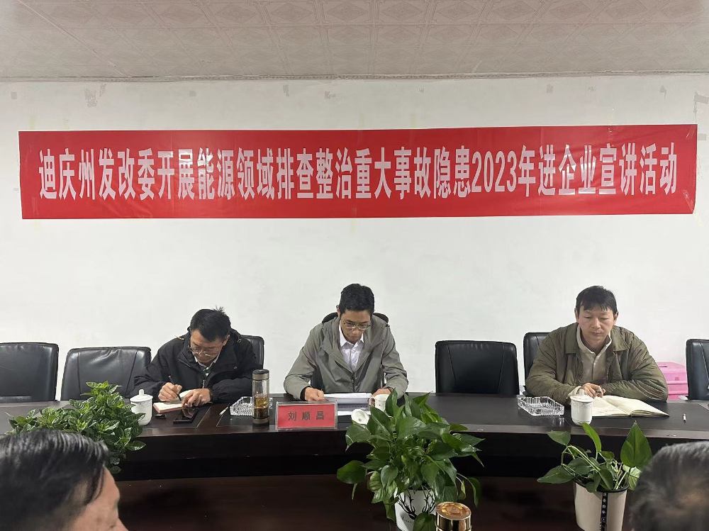 为提升企业安全生产本质水平,防范遏制重大安全事故发生,2023年11月7日,迪庆州发展改革委副主任、能源局局长刘顺昌到维西县洛爪河水电站开展重大事故隐患专项排查整治2023行动宣讲活动。维西县发展改革局副局长杜刚、维西恒发水电有限公司洛爪河水电站项目负责人张阿敦、电站技术总工、运行经理、水电站站长、安全管理员等10余人参加宣讲活动。