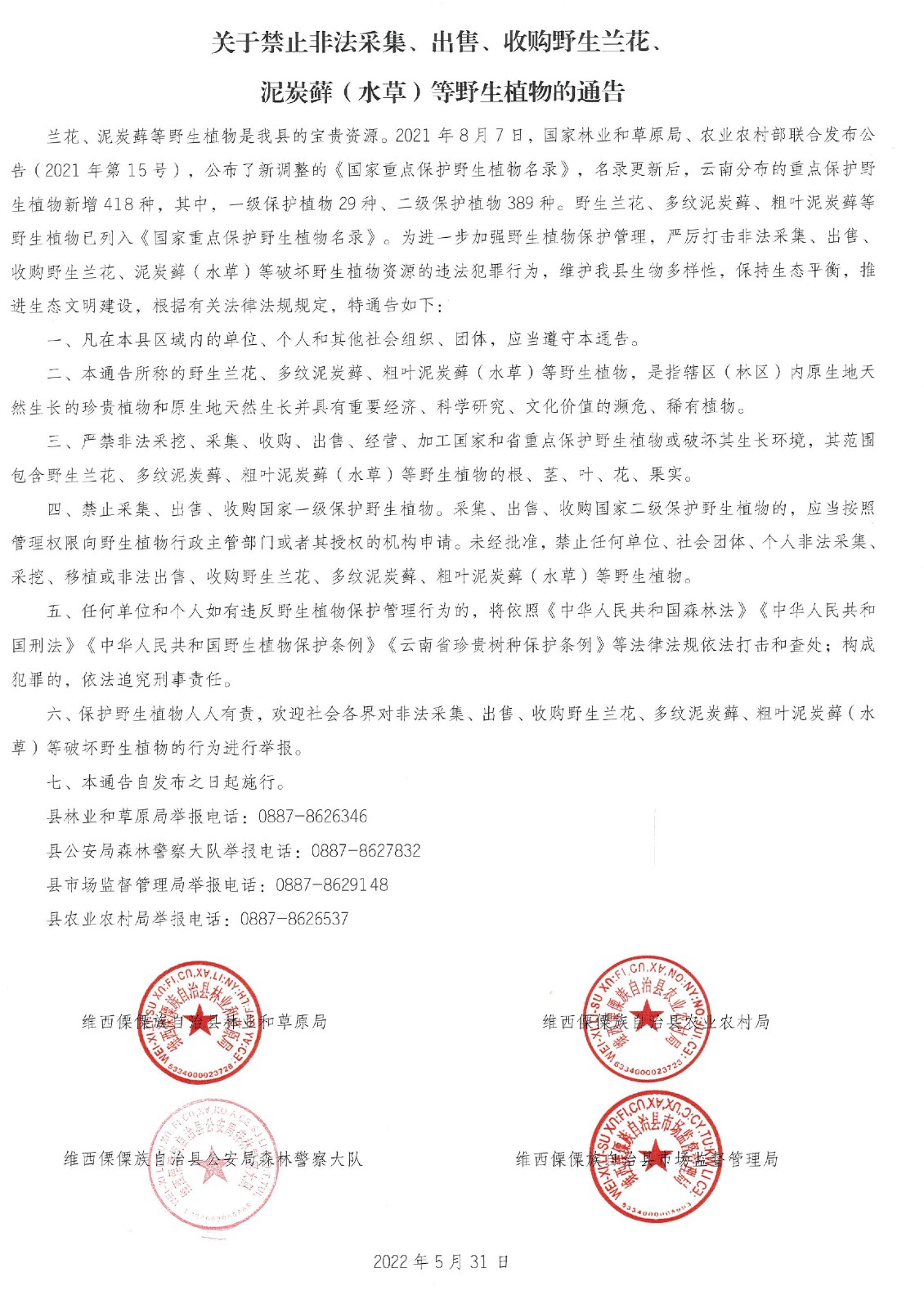 关于禁止非法采集、出售、收购野生兰花、泥炭藓(水草)等野生植物的通告