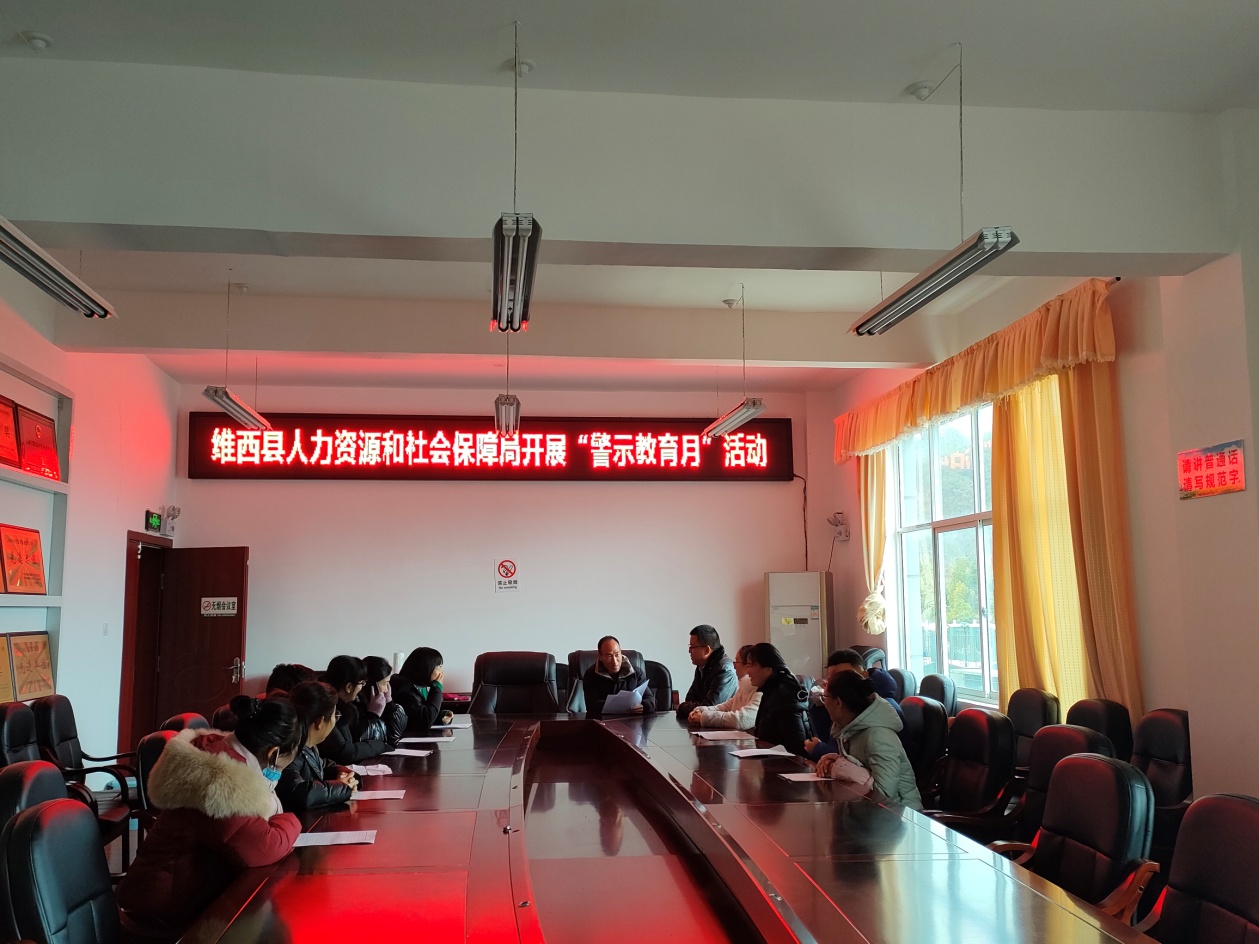 为确保社会保险基金、专项资金安全,按照人社部办公厅、省人社厅、州人社局统一部署,2021年12月23日维西县人力资源和社会保障局组织开展社会保险基金安全“警示教育月”活动,全局干部职工30余人参加活动。