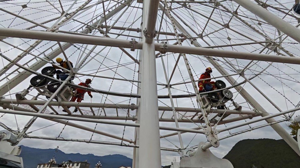 消防队员到达现场,了解了现场基本情况,确定无法启用备用电源和供电所短时间内无法正常供电的基本情况后,决定用手摇柄对摩天轮进行手动运行并利用人工救援设备进行救援,使座舱顺利回到站台,最终将被困“乘客”成功解救。