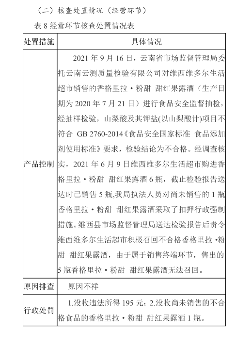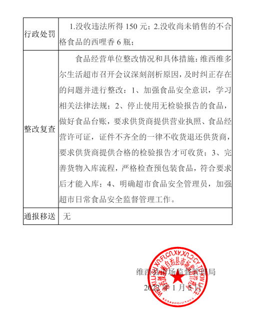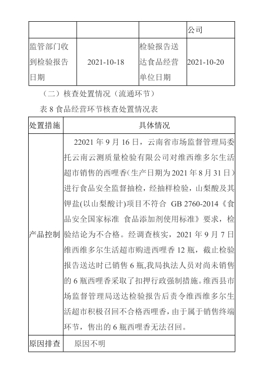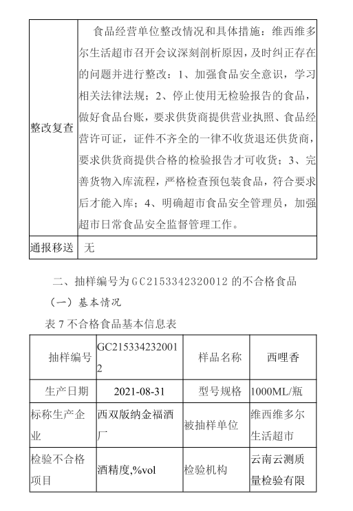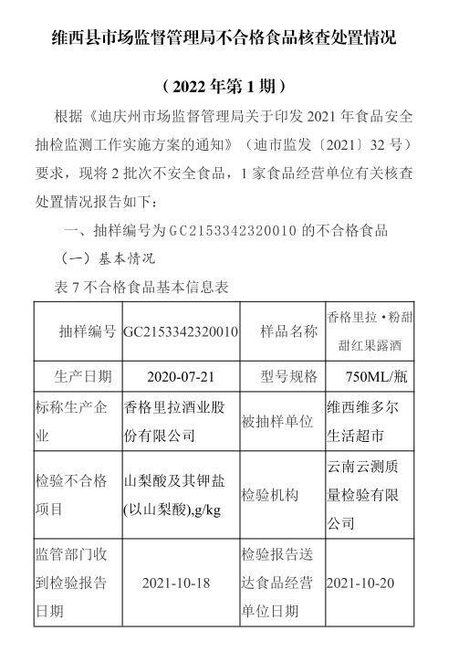 【食品药品安全信息公开】维西县市场监督管理局不合格食品核查处置情况 (2022年第1期)