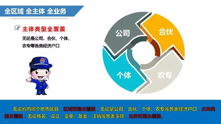 2、全区域 全主体 全业务。全省全面开展企业登记全程电子化工作,实现“三个覆盖”。无论省内哪个地市区县,区域范围全覆盖;无论是公司、合伙、个体、农专等各类经济户口,主体类型全覆盖;无论核名、设立、变更、备案、注销等各类事项,业务范围全覆盖。