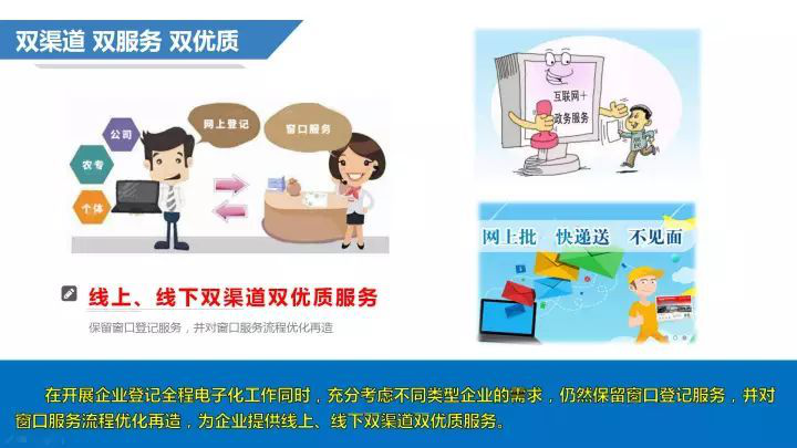 4、双渠道 双服务 双优质。在开展企业登记全程电子化工作同时,充分考虑不同类型企业的需求,仍然保留窗口登记服务,并对窗口服务流程优化再造,为企业提供线上、线下双渠道双优质服务。企业在获取电子营业执照的同时,还可以申请邮寄或到窗口领取纸质营业执照,充分满足经营者实际需要。