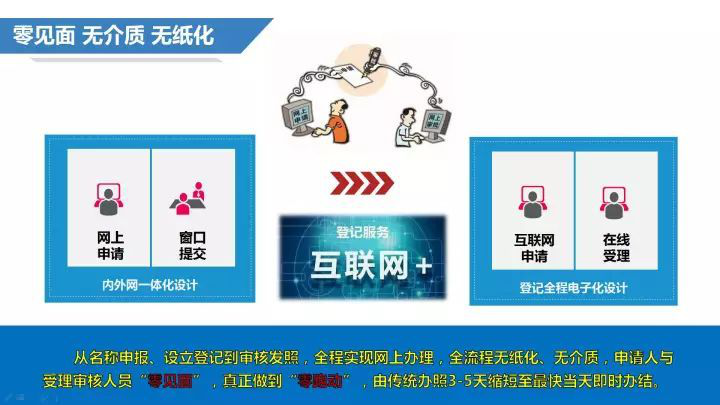 1、零见面 无介质 无纸化。 从名称申报、设立登记到审核发照,全程实现网上办理,全流程无纸化、无介质,申请人与受理审核人员“零见面”,真正做到“零跑动”,由传统办照3-5个工作日缩短至最快1个工作日。