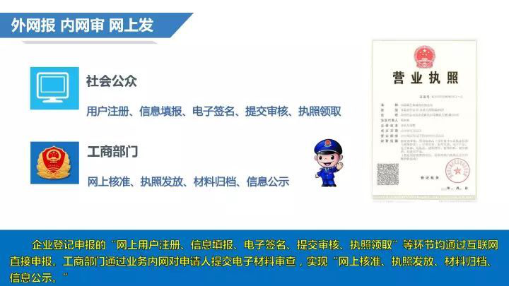 3、外网报 内网审 网上发。企业登记申报的“网上用户注册、信息填报、电子签名、提交审核、执照领取”等环节均通过互联网直接申报。市场监管部门通过业务内网对申请人提交电子材料审查,实现“网上核准、执照发放、材料归档、信息公示。”