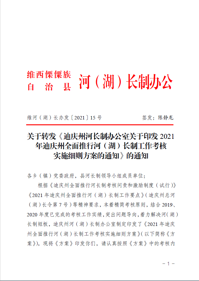 关于转发《迪庆州河长制办公室关于印发2021 年迪庆州全面推行河(湖)长制工作考核 实施细则方案的通知》的通知