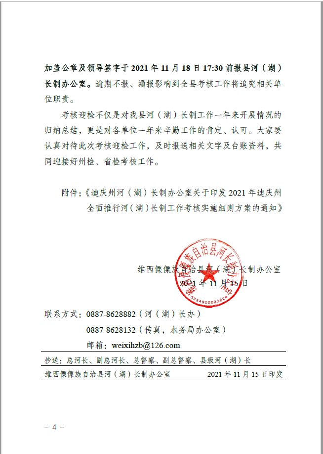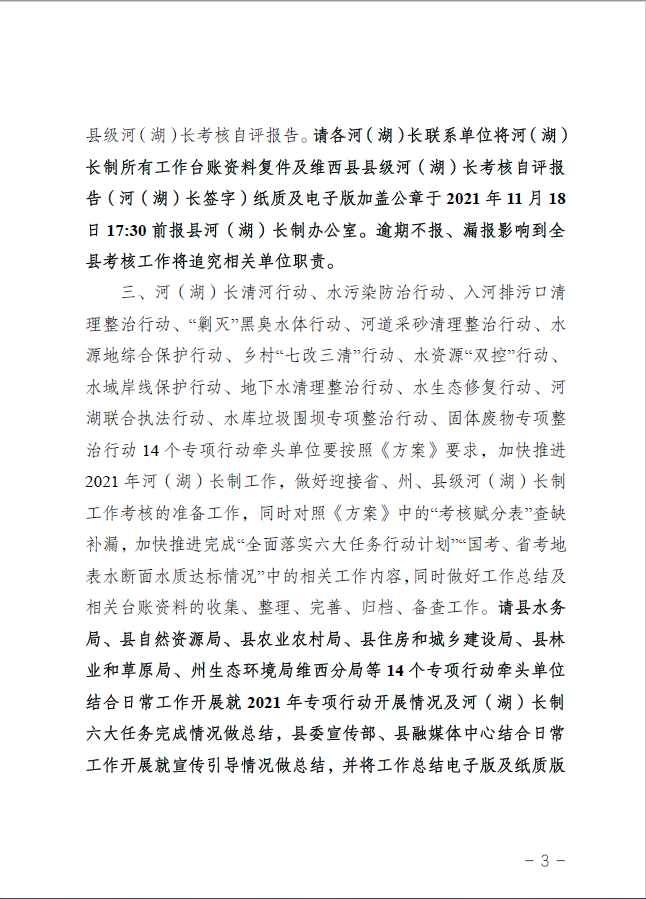 维西县河长制办公室关于印发2021 年维西县 全面推行河(湖)长制工作考核 实施细则方案的通知