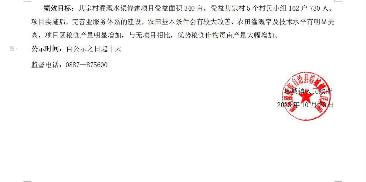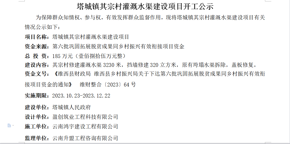 塔城镇其宗村灌溉水渠建设项目开工公示