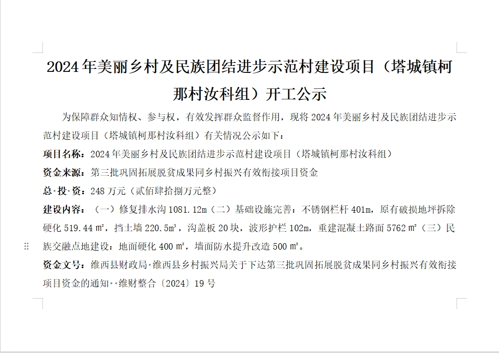 2024年美丽乡村及民族团结进步示范村建设项目(塔城镇柯那村汝科组)开工公示