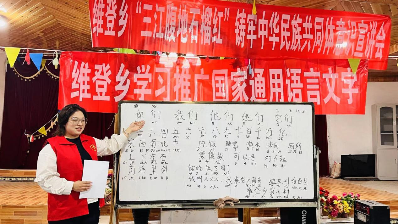 与本次推广国家通用语言文字同步进行的还有“三江腹地石榴红”铸牢中华民族共同体意识宣讲会,工作人员为在场人员做了宣讲和解释,工作人员的话语“声”入人心,大家听的入神。