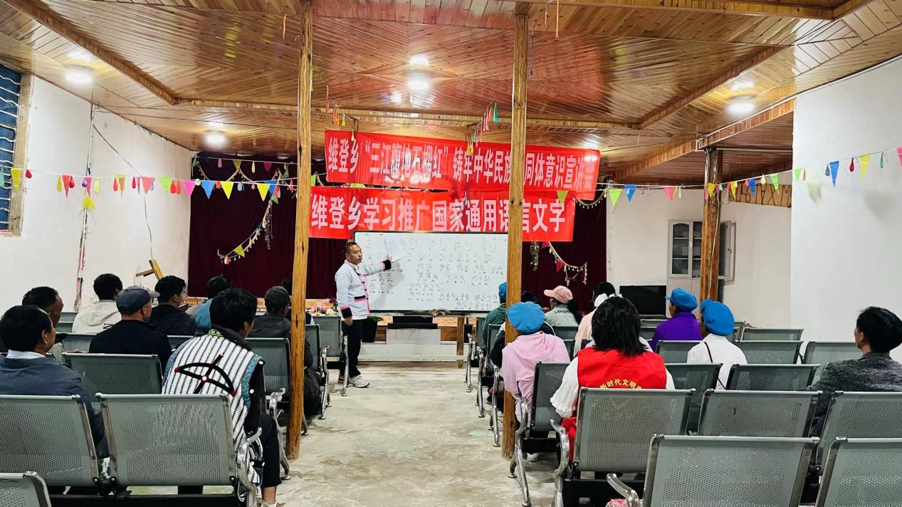 5月15日晚间,维登乡政府副乡长带领乡推广国家通用语言文字工作队的四名队员来到富川村托扒组基督教堂,为这里的信教群众开展普通话培训活动。托扒组全体党员、部分信教群众共计20余人参加培训活动。