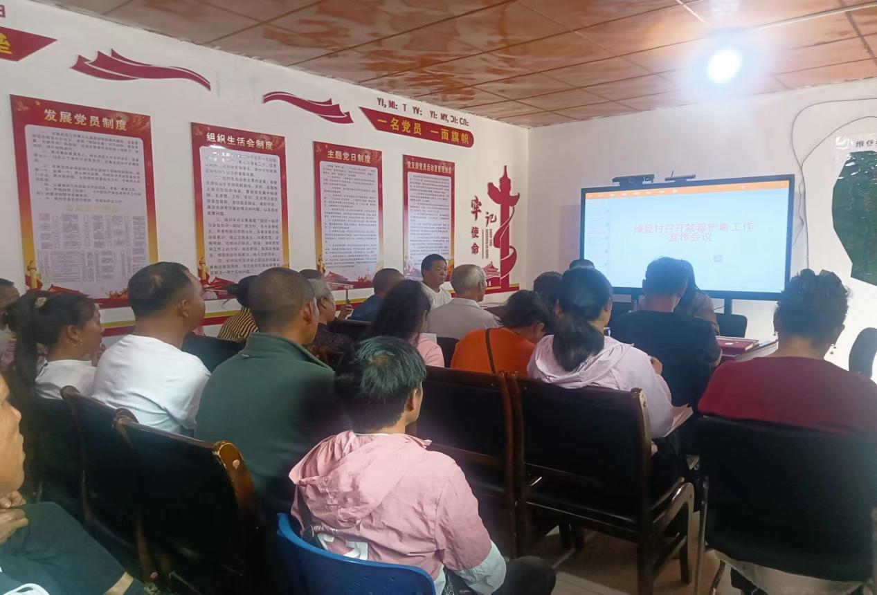 除此之外,工作人员还通过召开群众大会的宣传方式,让禁毒宣传进村入户、深入人心。各村总支书记通过展板展示毒品的种类、特征、危害等信息,让群众更直观地了解毒品,有效提高群众的禁毒意识。