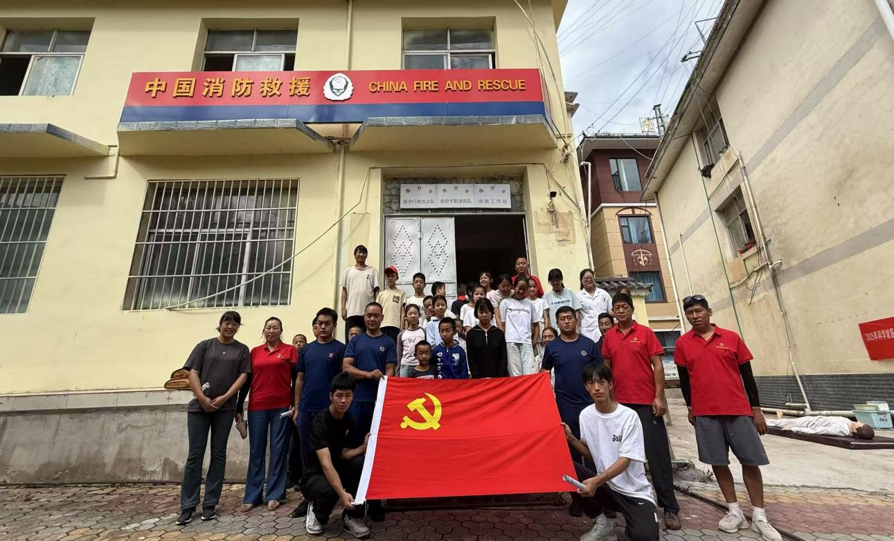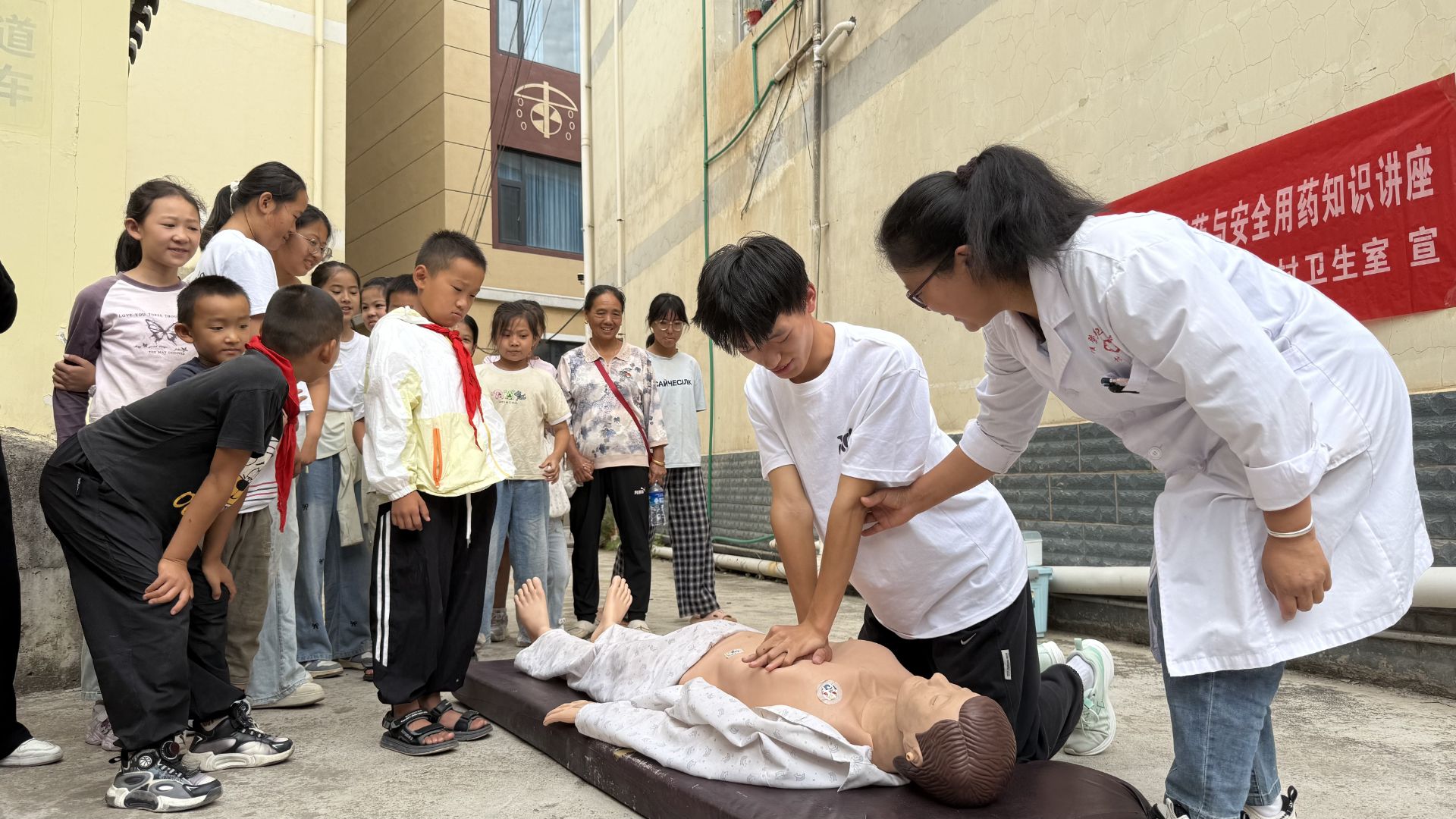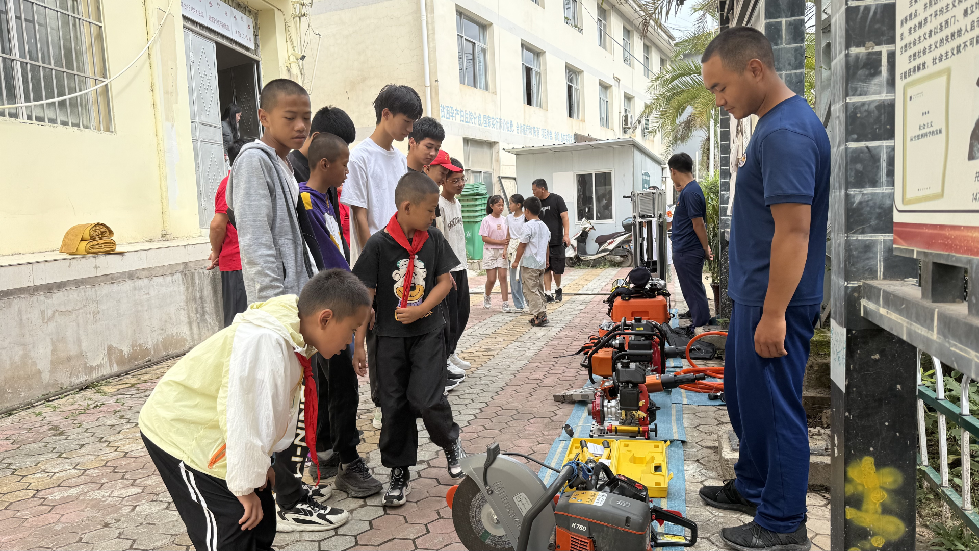 消防实操强技能,隐患防范有底气。宣讲环节后,活动转入实地体验阶段。全体人员在组织下参观了乡消防站,消防站工作人员精心准备,现场演示了部分消防救援器材的正确使用方法并向大家发放了消防知识宣传海报。演示过程中,工作人员耐心答疑解惑,针对青少年好奇点如“消防车的构造特点及装备情况”进行实地展示和讲解,使抽象知识转化为直观技能。紧接着,乡卫生院医生通过现场讲解、模拟示范、亲身体验等方式,为大家教授了心肺复苏、人工呼吸、伤口包扎等关键技能。为强化实践效果,活动鼓励青少年现场参与操作演练,多名青少年在医生的指导下现场尝试,不仅有效提升了动手能力,还让安全知识“活”了起来。