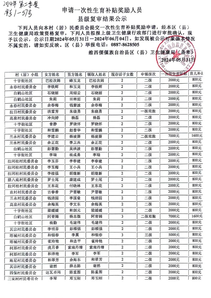2024年第二季度维西县申请一次性生育补贴奖励人员县级复审结果公示20240531