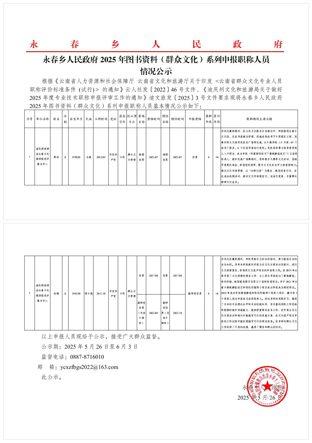 永春乡人民政府2025年图书资料(群众文化)系列申报职称人员 情况公示