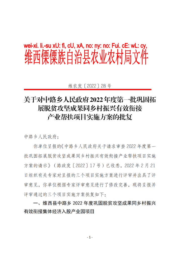 维农发〔2022〕28号 关于对中路乡人民政府2022年第一批巩固拓展脱贫攻坚成果同乡村振兴有效衔接产业帮扶项目实施方案的批复