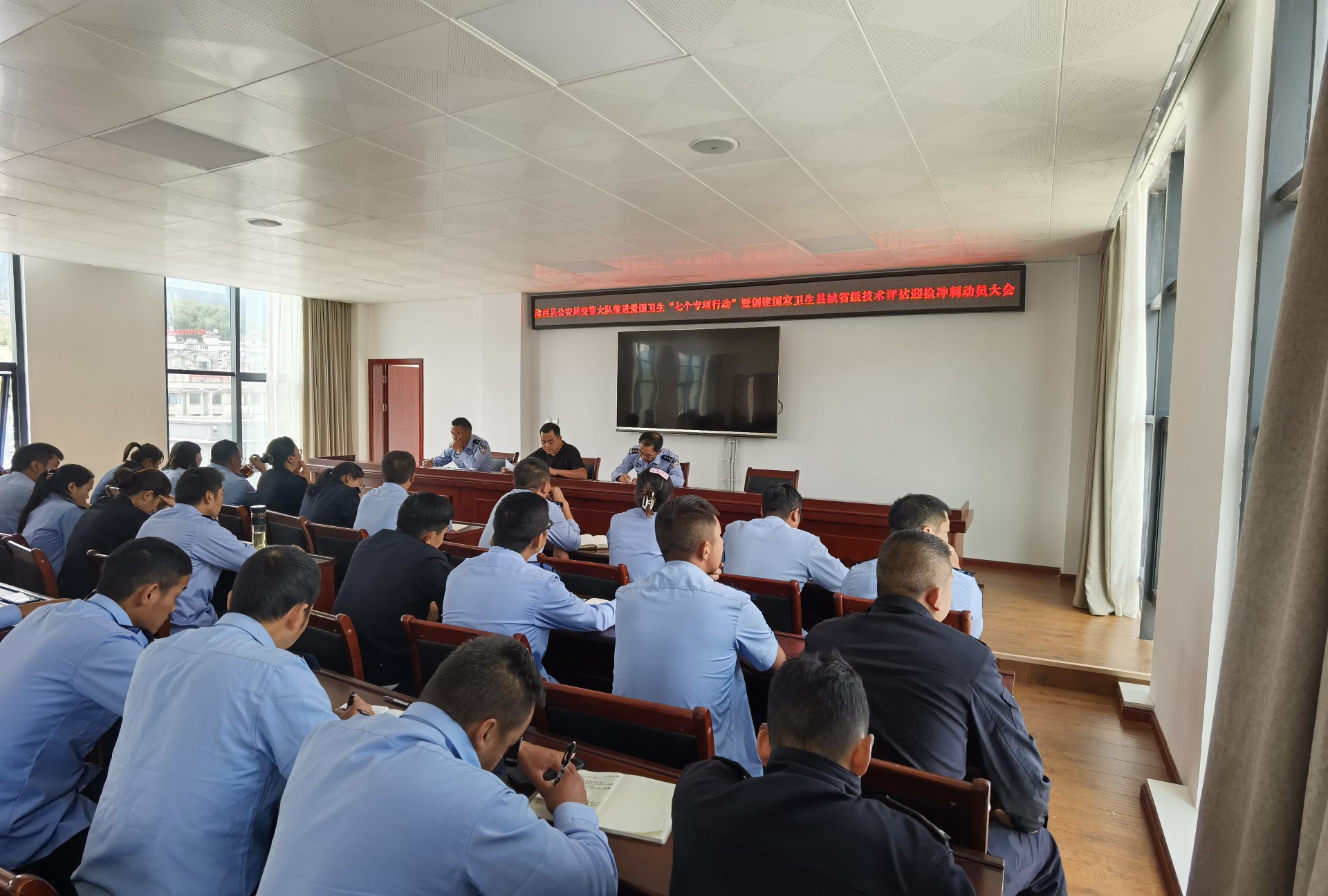 为迅速贯彻落实维西县推进爱国卫生“七个专项行动”暨创建国家卫生县城省级技术评估迎检冲刺动员大会会议精神,确保迎检工作取得实效,维西县公安局交警大队立即召开会议,部署爱国卫生“七个专项行动”暨创建国家卫生县城省级技术评估迎检冲刺工作。会议由赵镭大队长主持,大队在家班子成员、民辅警共计50余人参加会议。