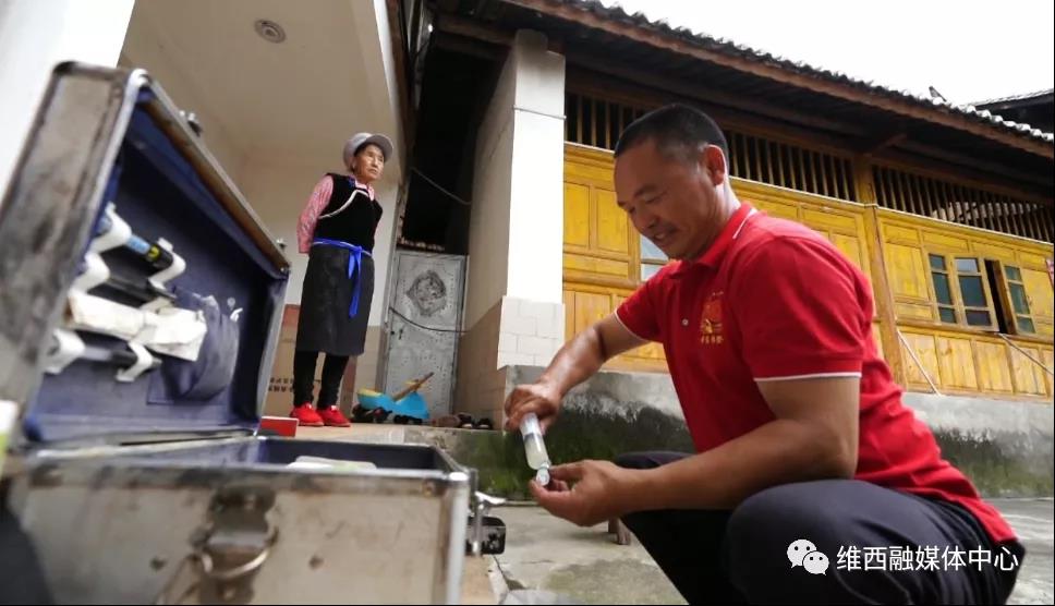 一大早,和德志就接到了村民的电话,说家里的猪生病了,和德志马上到药房装好药,背上他的药箱,骑上摩托车赶往村民家,看了猪的病情后诊断出病情马上配药给猪注射。作为富川村第三支部的支部书记,和德志还兼任村里的兽医,每年他都要为村里的牲畜进行疫苗注射,村民的牲畜生病了,第一时间想到的是给他打电话,接到电话后他会第一时间赶往现场诊断病情给牲畜配药。