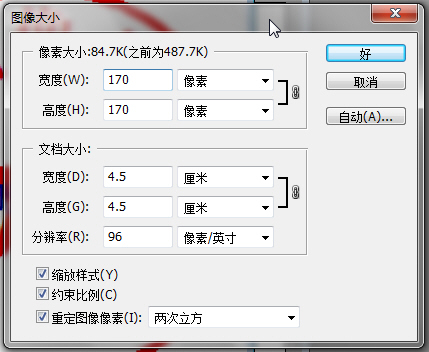 9.在弹出的“图像大小”对话框中将“像素大小”中的宽度和高度改为170像素,“文档大小”中的“分辨率”改为96dpi(像素/英寸),然后单击“好”按钮完成图像大小的更改。