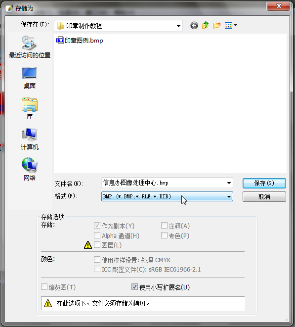 11.在弹出的“存储为”对话框中选择“保存在”位置为以“印章全称”为名的文件夹,保存的文件名以“印章全称”为名,格式选择“BMP”类型,然后单击“保存”按钮。