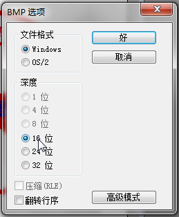 12.在随后弹出的“BMP选项”对话框中选择文件格式为Windows,深度选择16位,之后单击“好”按钮完成保存。