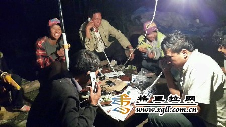 晚,尼西乡幸福村灾区群众围坐在移动爱心业务点,使用移动爱心免费座机给亲人报平安。