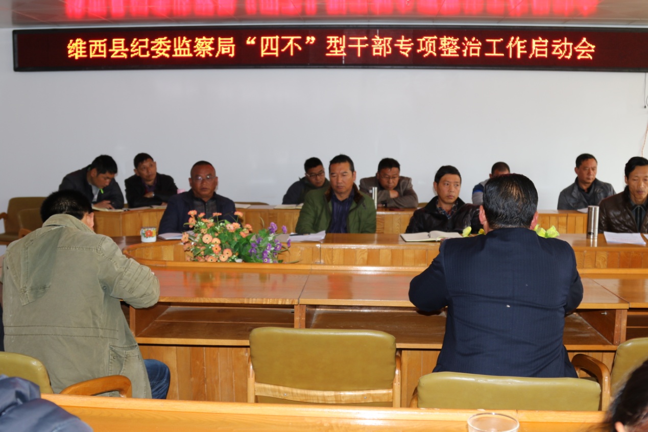 为积极贯彻落实好县委的决策部署,2017年3月3日,维西县纪委监察局召开“四不”型干部专项整治工作动员会,会议由县委常委、纪委书记齐中生同志主持,全体纪检监察干部参加了会议。会议通报了县纪委监察局专项整治“四不”型干部的自查报告,自查报告客观真实地反映了县纪委监察局内部存在的实际问题和具体表现。全体纪检监察干部针对“四不”型干部的表现,结合自身实际,认真开展自检自查,并依次进行了表态发言。