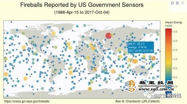 NASA发布的自1988年-2017年全球范围内小行星撞击事件的分布图及详细情况
