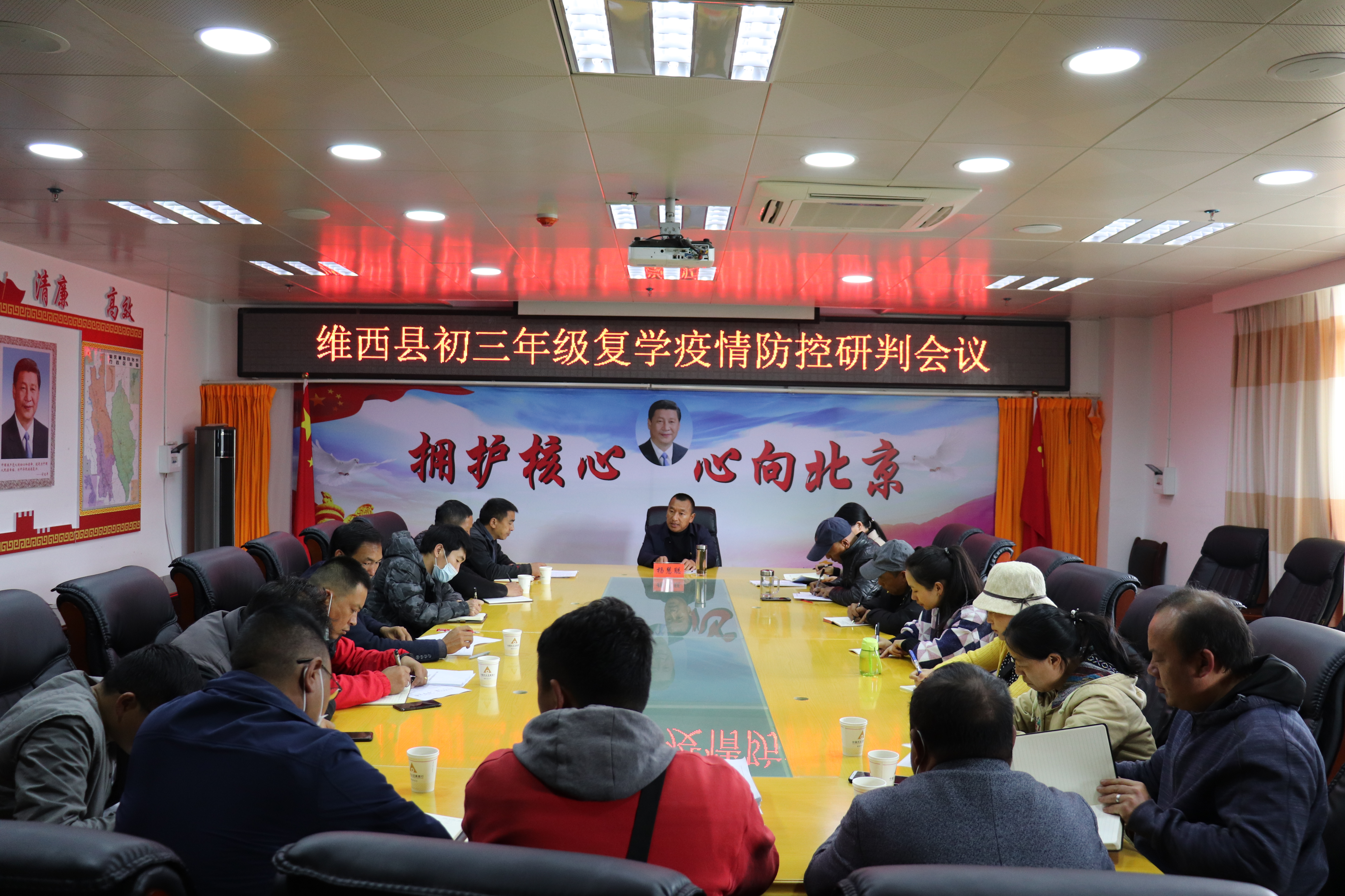 为深入贯彻落实中央和省、州关于学校复学疫情防控工作相关要求,进一步压实责任、聚焦重点,确保全县初三学生如期复学。2020年3月28日,县人民政府副县长杨慧聪主持召开初三年级复学疫情防控工作研判会,会议听取了维西三所中学复学准备情况,并就学校准备情况进行了深入研判分析,安排部署了校园疫情防控具体工作。