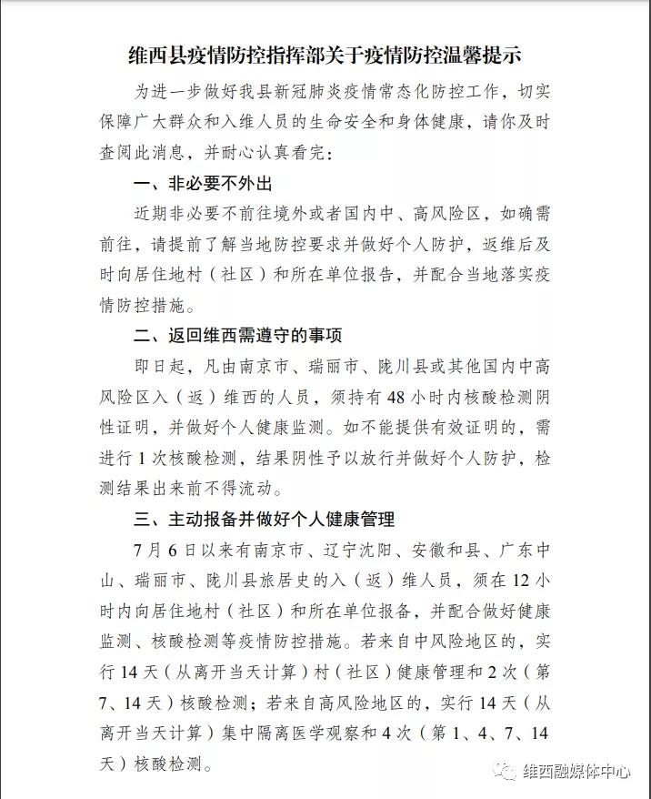 维西县疫情防控指挥部关于疫情防控温馨提示