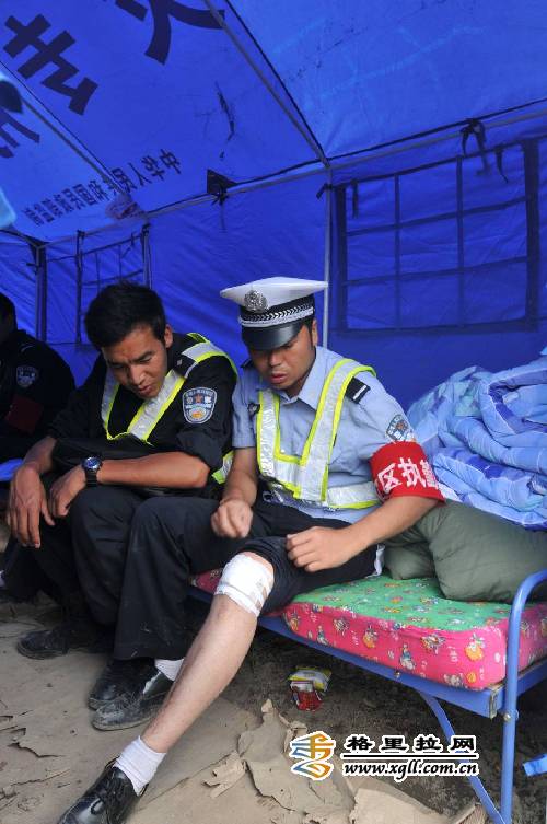 连日来,在奔子栏镇灾区广大救灾人员冒着余震不断,落实不断,坍塌不断的危险坚持一线救灾抗灾,灾区各项救援工作得到有序推进。31日早8时10分左右,正在灾区巡查路况及山体坍塌现场的奔子栏镇交警中队民警遇到了突发地震。山体落石砸中中队长和丛华左腿。图为和丛华正在灾区安置点接受治疗。(石显尧和泰君江初张德海摄影报道)