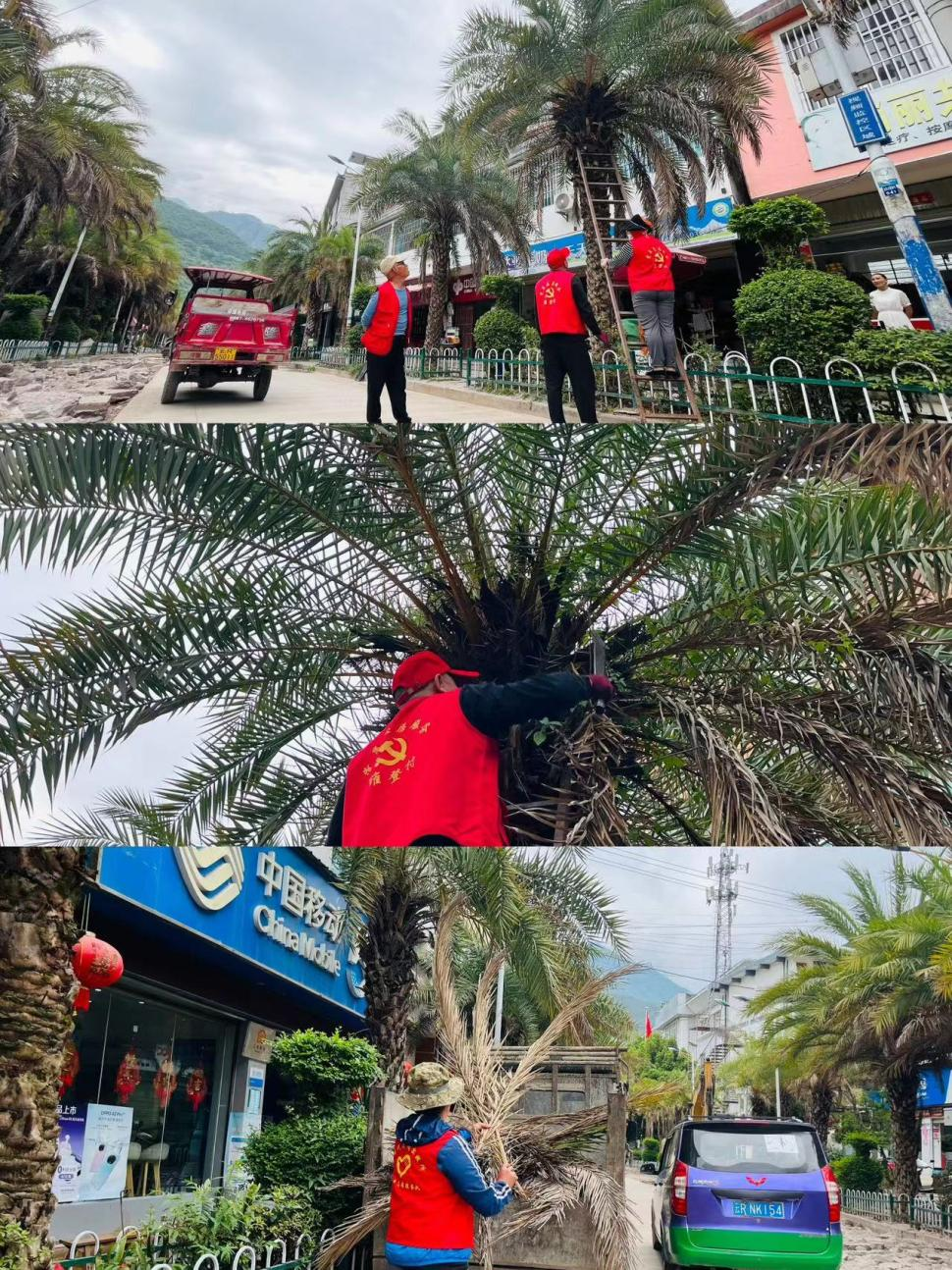 大家分工合作,有的搬运梯子,有的修理树枝,还有清理枯枝烂叶并对其进行打包装车,大伙三五成群,干得热火朝天,期间还有不少附近的群众主动加入到了清扫的队伍中。