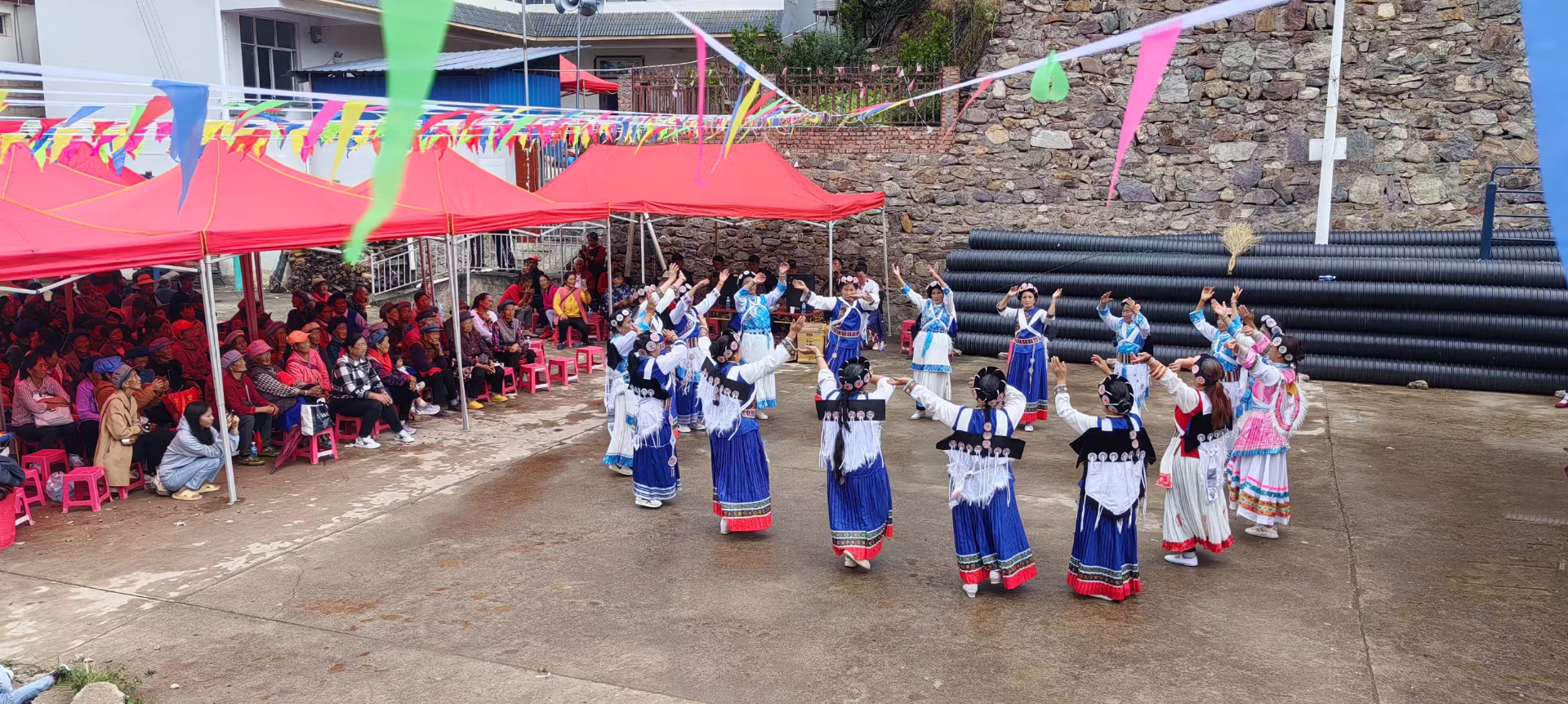 在富川村,村委会两旁的道路上彩旗飘飘,欢声笑语不断。在村文化活动广场,一场以“欢度重阳,关爱老人”为主题的庆祝活动正在如火如荼地进行。全村数六十余名老人欢聚一堂,共享美好时光。
