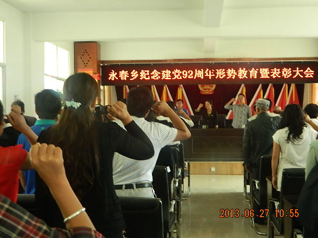 2013年是中国共产党成立92周年,也是全面贯彻落实党的十八大精神开局之年。为纪念和庆祝党的生日,激励全乡广大党员干部继续解放思想、开拓进取,推动科学发展,促进社会和谐稳定,在实现永春经济社会又好又快发展目标中奋勇争先,建功立业。我乡提前谋划,精心组织,开展形式多样的活动,庆祝党92岁生日。召开一次党员大会。2013年6月27日上九点,永春乡召开了党员大会,乡党委书记魏承江作了重要讲话:全面回顾了...