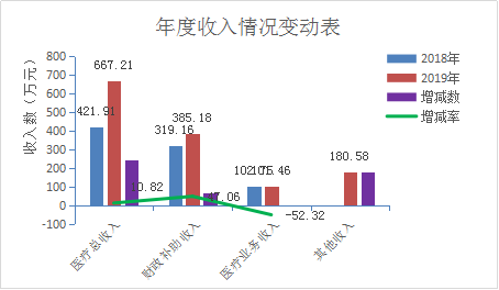 2019年度本单位收入与上年度相比增加245.30万元,同比增加10.82%。其中一般公共预算财政拨款增加66.02万元,同比增加47.06%,医疗业务收入减少1.29万元,同比减少2.32%,其他收入增加180.58万元。如下图所示: