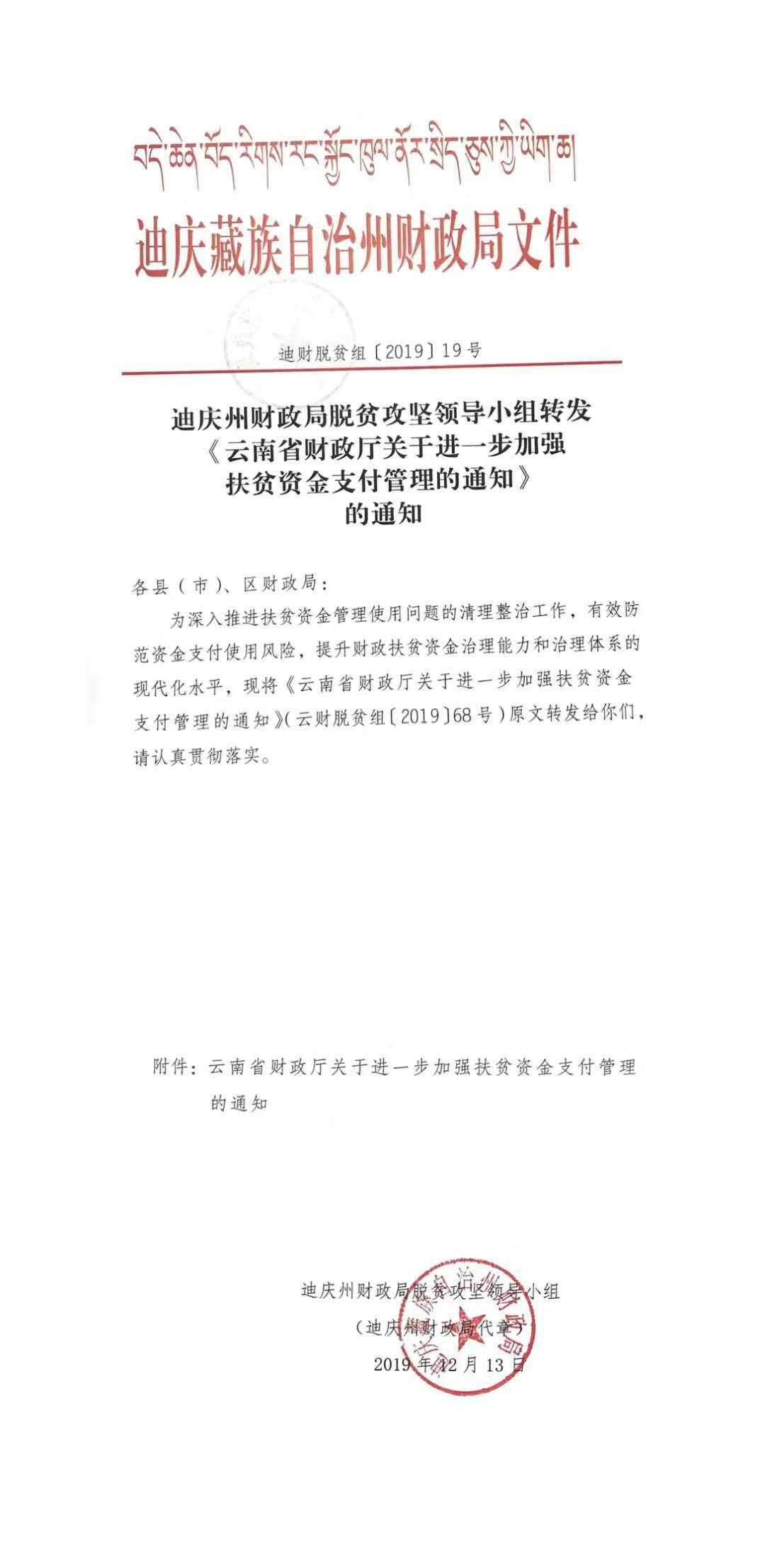 【扶贫项目资金公示】迪庆州财政局脱贫攻坚领导小组转发《云南省财政厅关于进一步加强扶贫资金支付管理的通知》的通知
