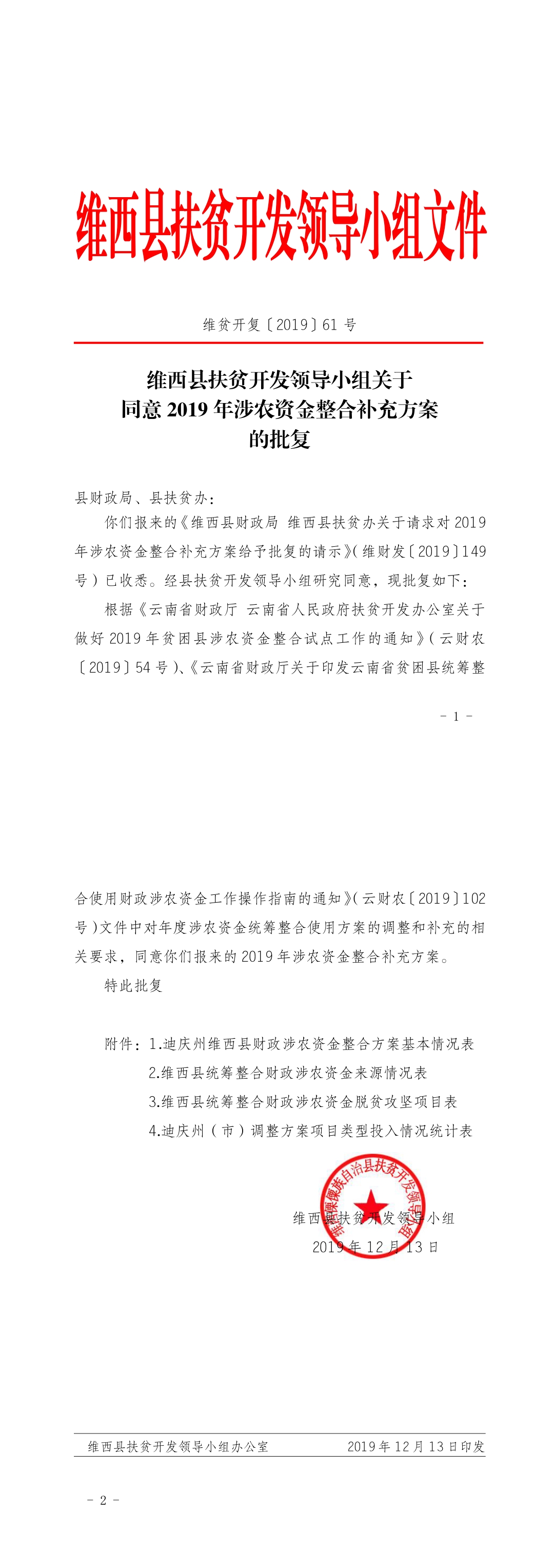 【扶贫项目资金公示】维西县扶贫开发领导小组关于同意2019年涉农资金整合补充方案的批复