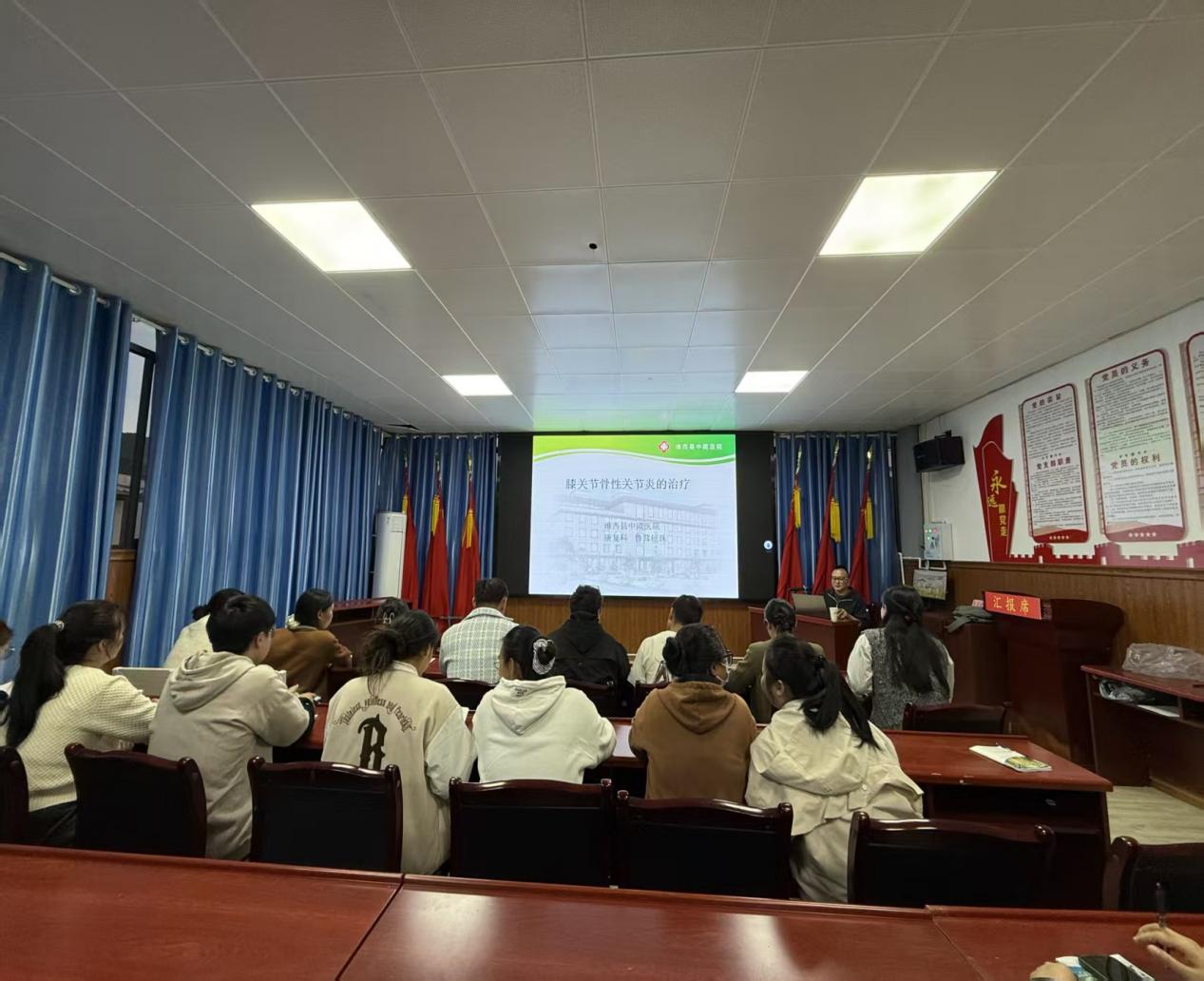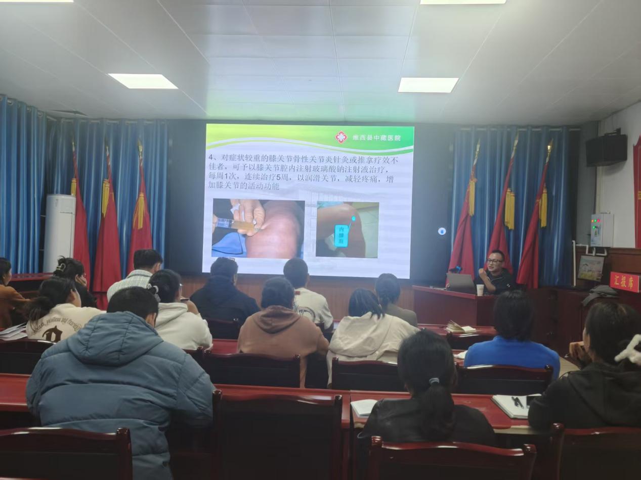 为进一步强化医护人员对膝关节骨性关节炎的诊疗能力,夯实中藏医特色康复服务基础,更好地满足辖区群众对优质医疗的需求,维西县中藏医院于2025年10月16日19:00组织开展膝关节骨性关节炎治疗知识培训,康复科主任鲁茸顿珠老师主讲,全院医护人员积极参与。