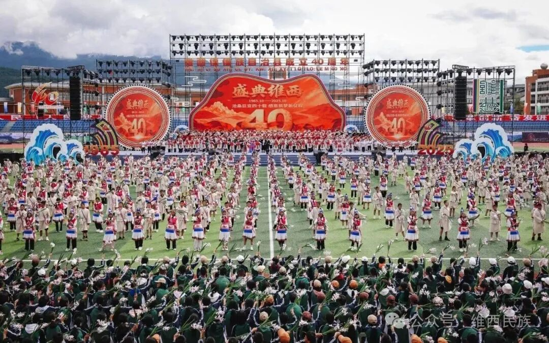10月12日至13日,维西傈僳族自治县成立40周年庆祝大会在维西县体育场隆重举行。本次庆典精心构建了“1台主题晚会+1场文艺汇演+1场国家级慰问演出+1场非遗展演+1个成就展+1场非遗文创展销区”的多元活动框架,全面展示了维西县“沧桑巨变四十载・感恩筑梦新征程”的辉煌成就。