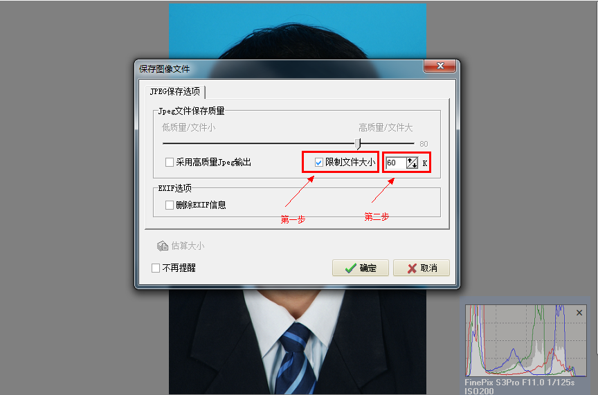b)首先勾选“限制文件大小”,输入大小“60”,然后点击“确定”保存照片。 |