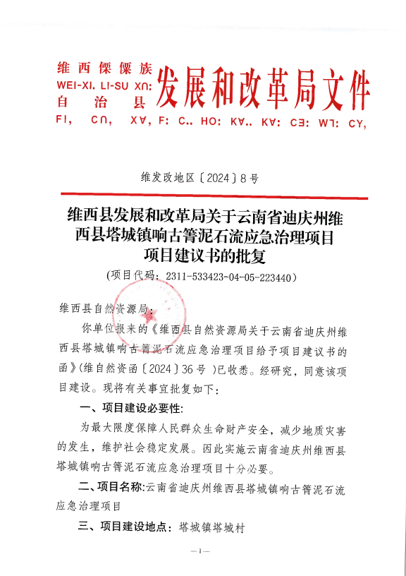 维西县发展和改革局关于云南省迪庆州维西县塔城镇响古箐泥石流应急治理项目项目建议书的批复